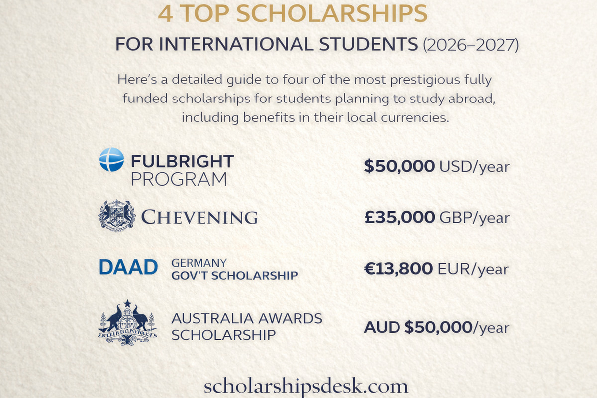 4 Top Scholarships for International Students (2026–2027) is a practical guide to four well-known government-funded scholarship routes for students planning to study abroad.